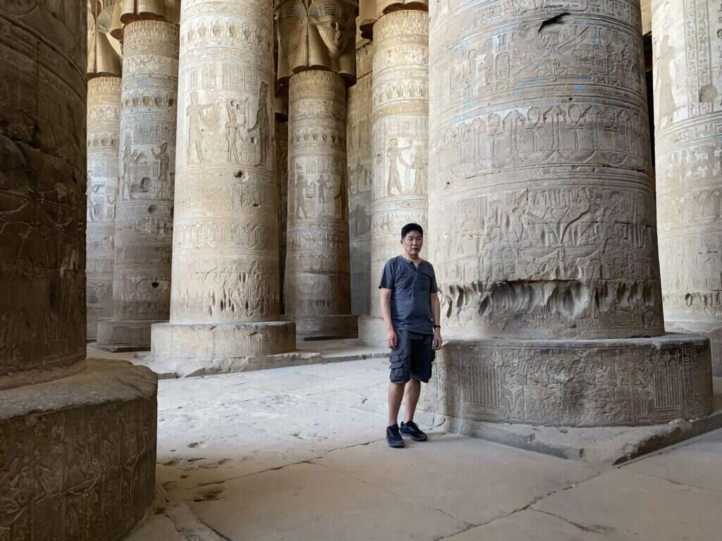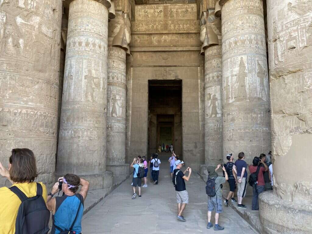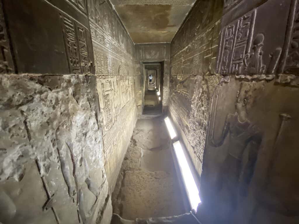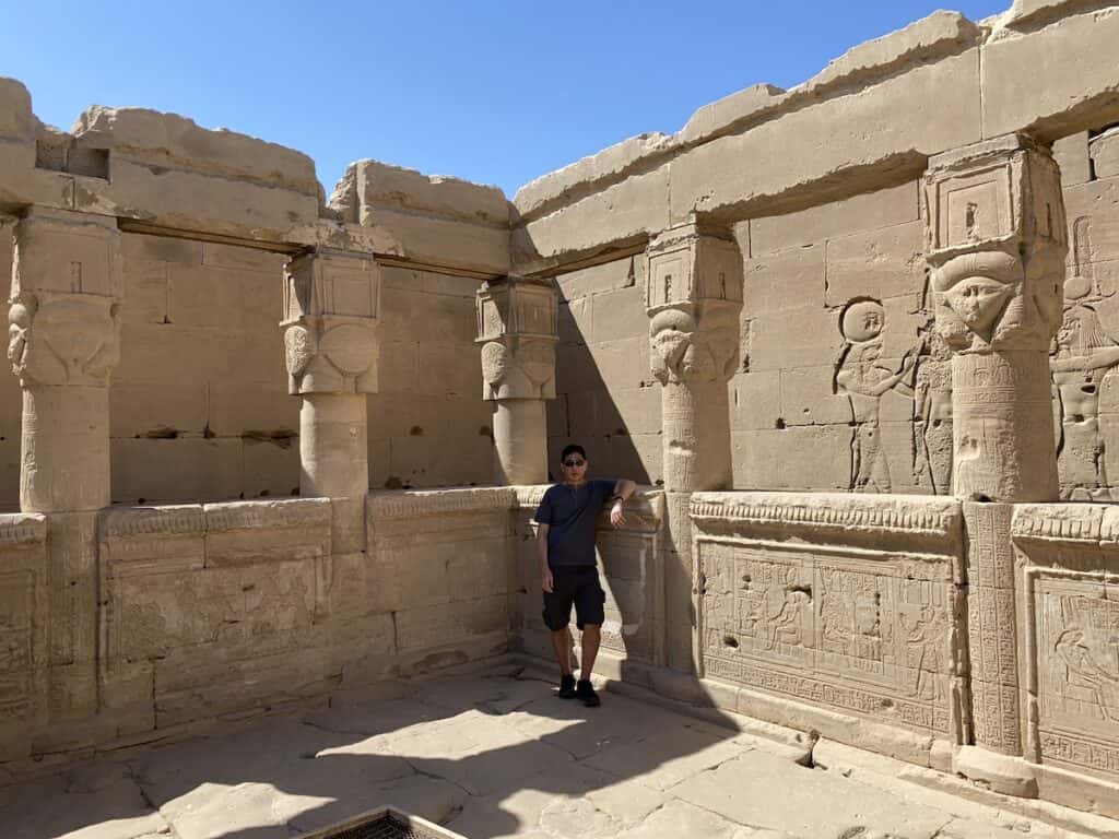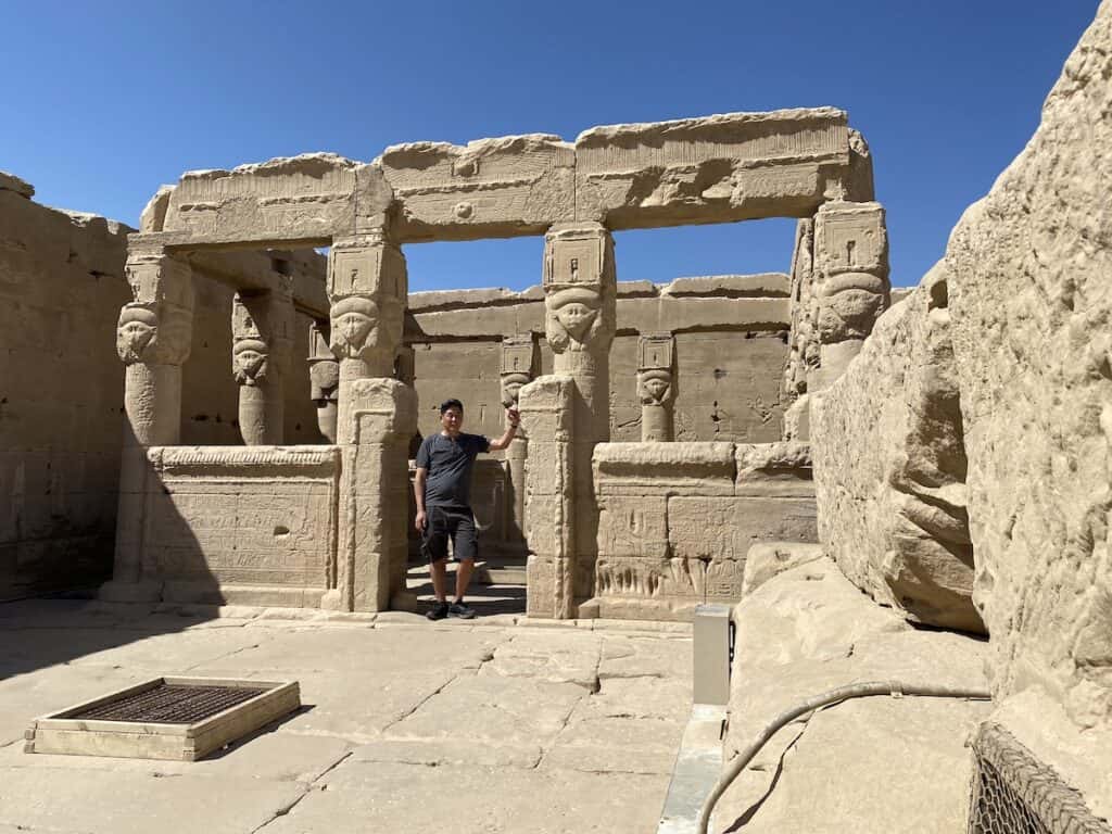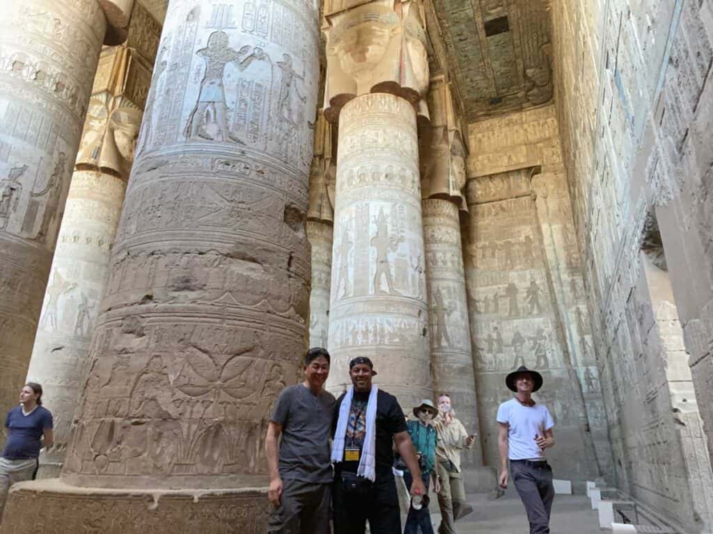 Temple of Hathor in Dendera. It’s famous for a stone relief called, the Dendera Lightbulb. Nice, fat columns here, with some original faded colors, even on the ceiling.