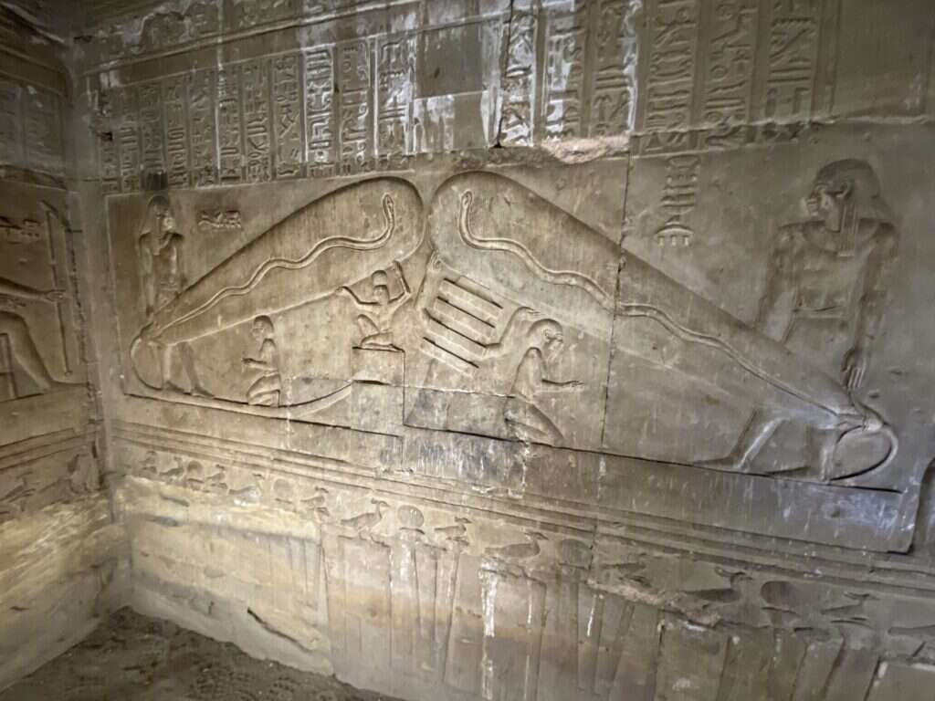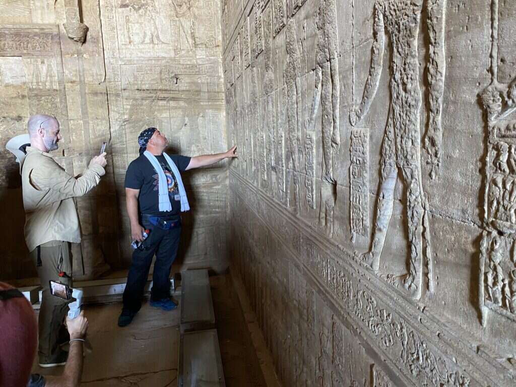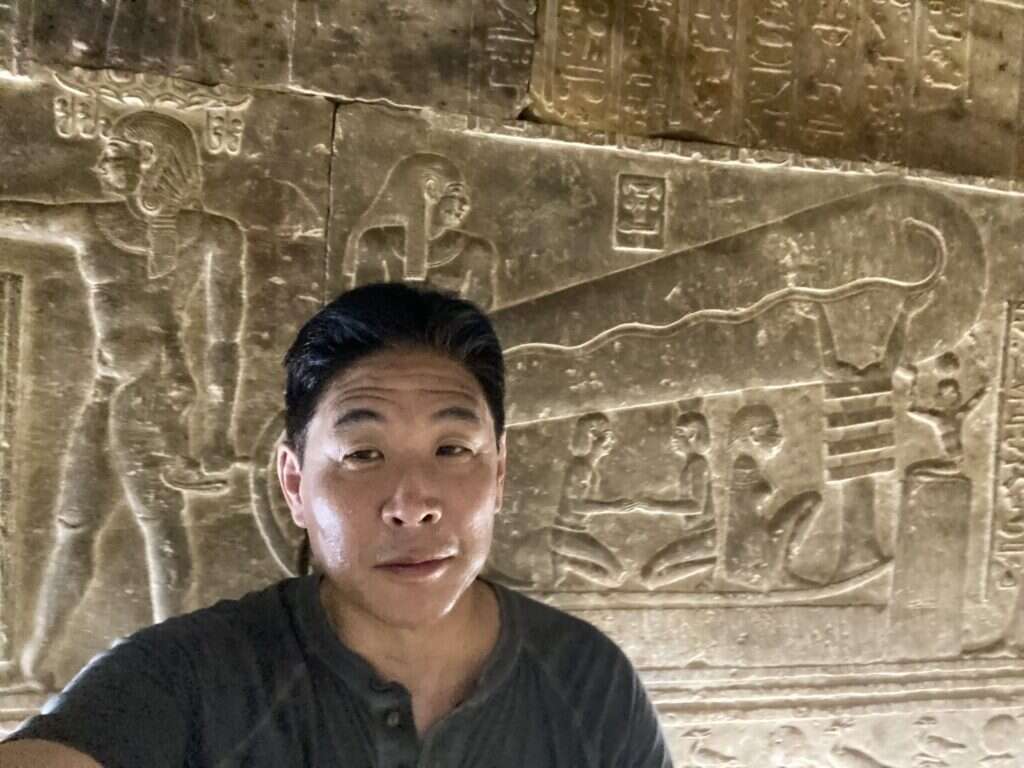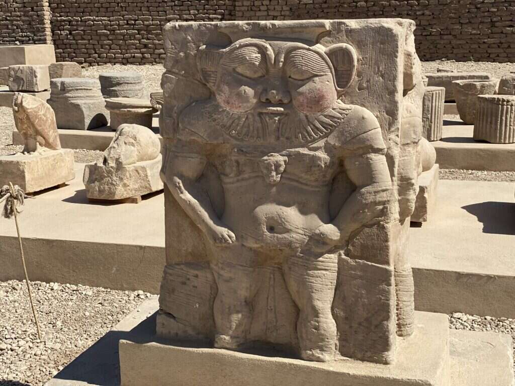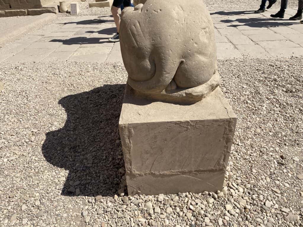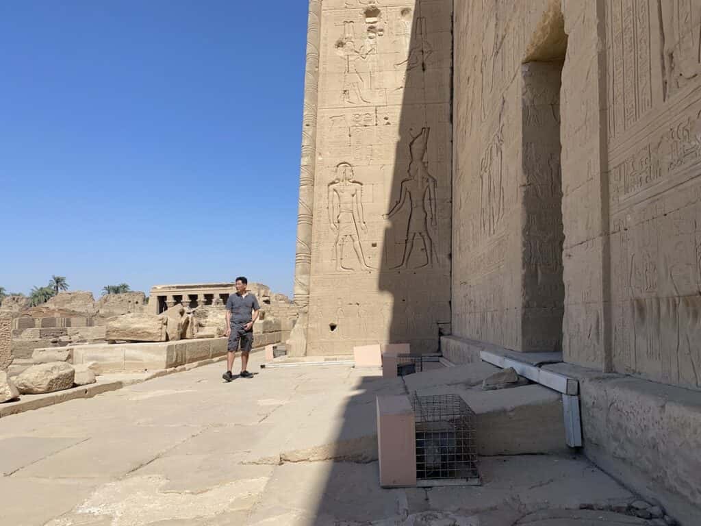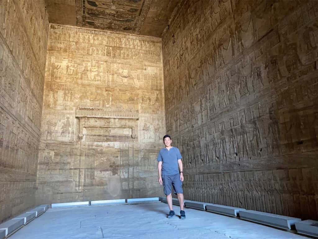 Temple of Hathor in Dendera. It’s famous for a stone relief called, the Dendera Lightbulb. Nice, fat columns here, with some original faded colors, even on the ceiling.